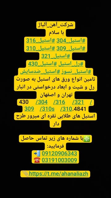 شرکت_آهن_آلیاژ با سلام تامین انواع ورق های استیل به صورت رل و شیت و ابعاد درخواستی در انبار تهران و اصفهان 430 /304 /316 /321 /309 /310s /310.4841 استیل های طلایی نقره ای میرور طرح دار جهت استعلام موجودی و با شماره های زیر تماس حاصل فرمایید: 09120906343 03191003009 https://te/ahanaliazh